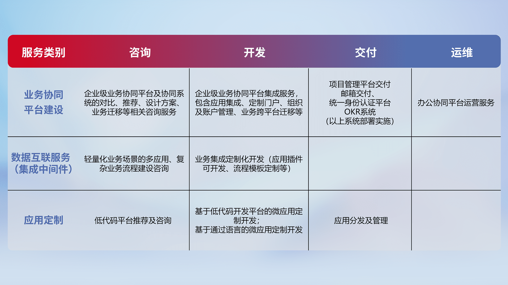 针对钉钉、、、、企微、、IDaas等平台级产品提供产品的规划、、方案、、、、交付、、、、定制化开发等服务,,,,实现如统一协同办公、、智能客户服务、、混合会议管理、、智能数据查询、、、等业务场景,,实现数字化转型。。。。